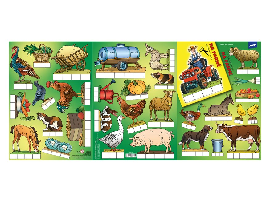 Vystřihovánky Na farmě. Zažijte spoustu zábavy s vystřihovánkou pro děti s tématikou domácích zvířat na farmě. Vystřihovánky MFP Farma jsou na 3 listech formátu A4. Najdete zde prase, koně, ovečku, kohouta, husu, králíka, krávu, psa, kuřátka a spoustu dalších zvířat, které nesmí chybět žádnému farmáři.