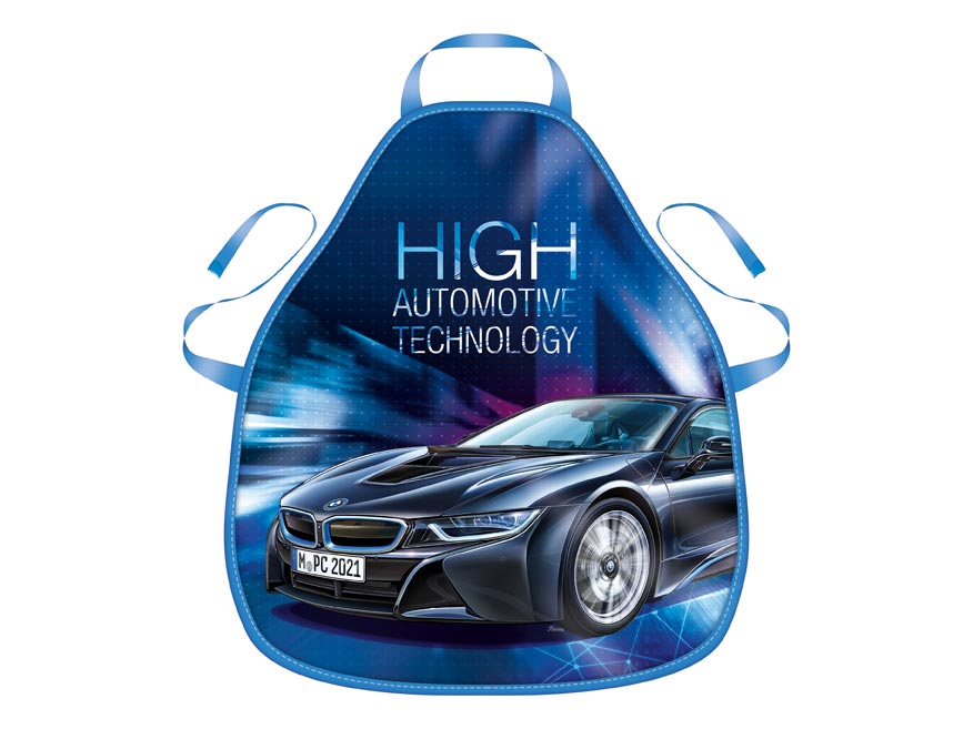 Školní zástěra s motivem závodního auta a nápisem “High Automotive Technology”. Vhodná do pracovní výchovy, ale také na domácí tvořeni. Zástěra se zavazuje za krkem a kolem pasu.