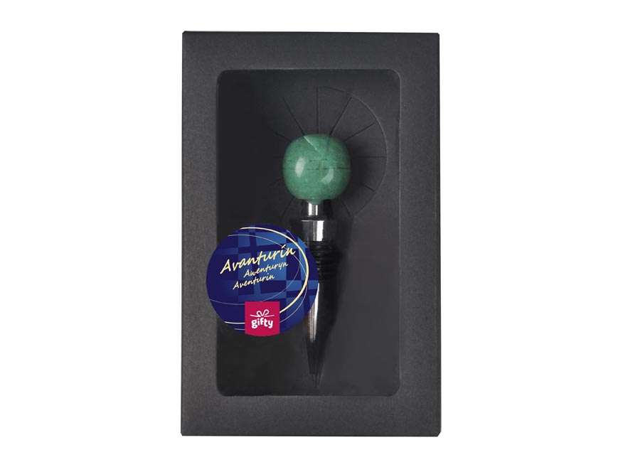 Zátka na víno z kolekce Gifty s avanturínem je jedinečný a stylový doplněk, který kombinuje přírodní kámen a praktické využití. Horní část zátky zdobí avanturín v jemném zeleném odstínu, který byl precizně opracován do hladkého a elegantního tvaru. Avanturín je často považován za kámen štěstí, klidu a harmonie. Funkční část zátky tvoří kovové tělo s kvalitním těsněním z termoplastické gumy, které spolehlivě uzavře láhev a pomáhá uchovat svěžest nápoje. Avanturín dodává zátce nejen estetickou hodnotu, ale i nádech luxusu a originality.