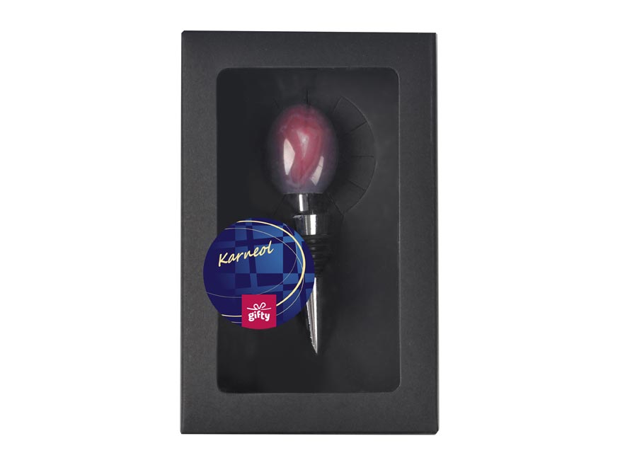 Zátka na víno z kolekce Gifty s výrazný polodrahokamem karneolem, známým svou ohnivou barvou a symbolikou odvahy a vitality, promění každou láhev vína v designový skvost. Uzávěr zátky je zhotoven z odolného pochromovaného kovu, který spojuje praktickou funkčnost s nadčasovou elegancí. Díky těsnění z pružné termoplastické gumy pevně přilne k hrdlu lahve, čímž dokonale uchová čerstvost a aroma vína. Perfektní jako dárek !