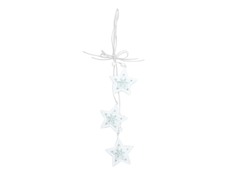 Vánoční ozdoba hvězdy se závěsem. Závěs obsahuje 3 hvězdy. V horní části je očko s provázkem a korálkem, který umožňuje snadné zavěšení. Ozdobu můžete zavěsit na dveře, okno, nebo jinak zkrášlit vaše bydlení.