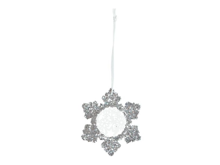 Vánoční dřevěná dekorace vločka v bílé barvě s glitterm a závěsem. Tato vánoční ozdoba je vyřezaná z překližky. V horní části je očko s provázkem, které umožňuje snadné zavěšení. Můžete použít na ozdobení vánočního stromečku, zavěsit na dveře, okno, nebo jinak zkrášlit Vaše bydlení.