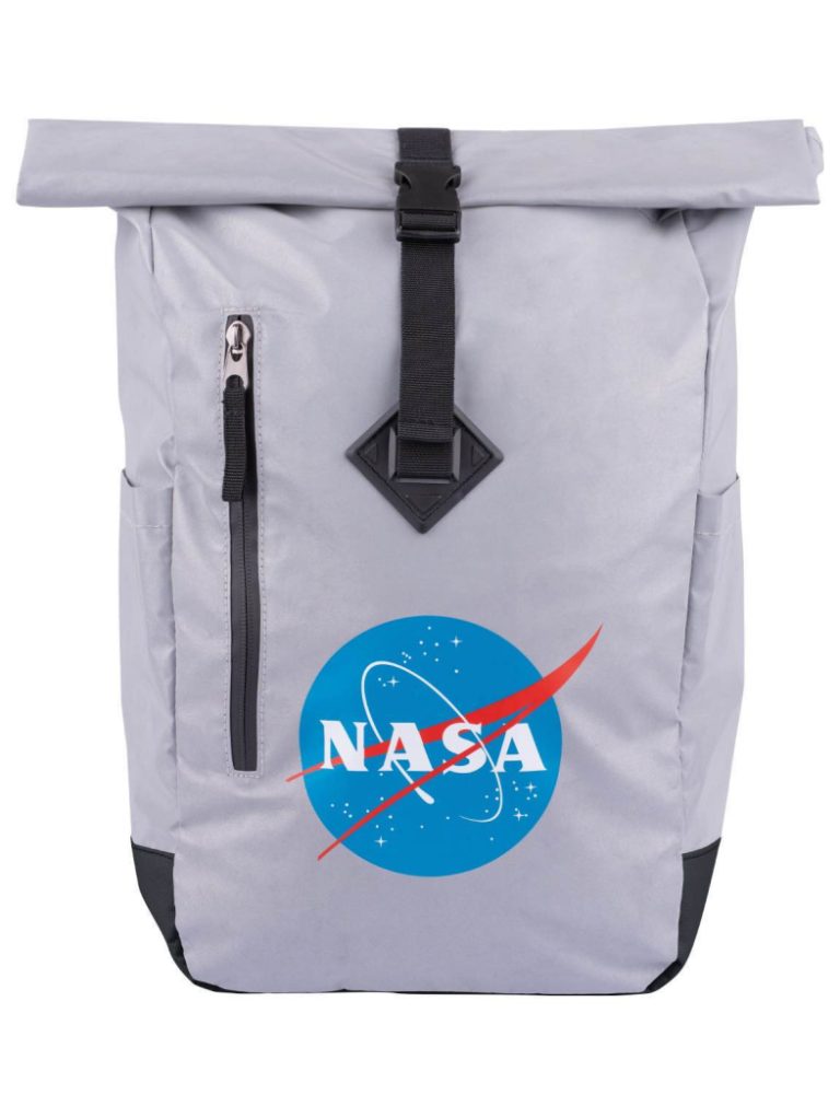 • Stříbrný lifestylový roll-top batoh ušitý z reflexního materiálu, doplněný o ikonické logo NASA.