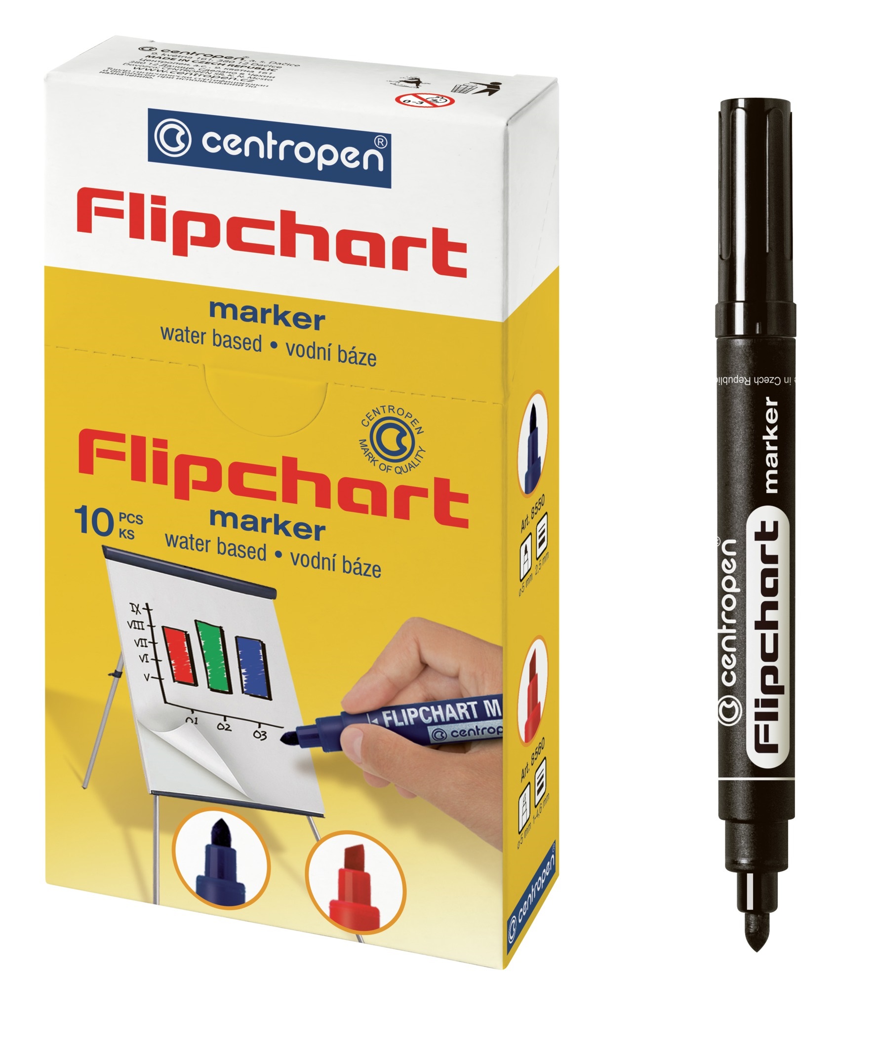10/ značkovač na papírové tabule, nevysychavý inkoust (vydrží i 7 dní bez chránítka), nepropíjí se papírem, válcový hrot, šířka stopy 2,5 mm