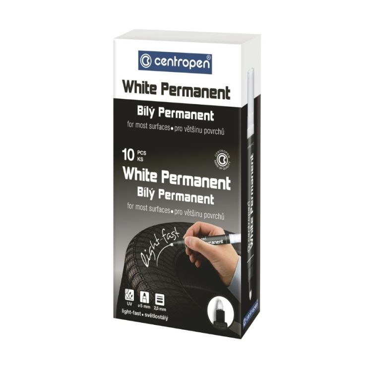 10/ univerzální bílý značkovač, píše na většinu povrchů, po zaschnutí odolá za sucha otěru, na porézních površích permanentní, světlostálý, vodní báze, válcový hrot, šířka stopy 2,5 mm