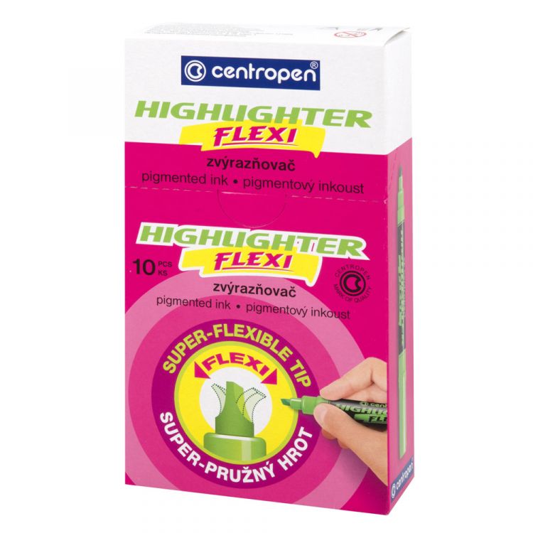 10/ velkokapacitní zvýrazňovač se super pružným hrotem, pro hladké a pohodlné zvýraznění textu na všech druzích papírů, fluorescenční pigmentový inkoust, odolnost proti UV záření, klínový hrot, šířka stopy 1 – 5 mm