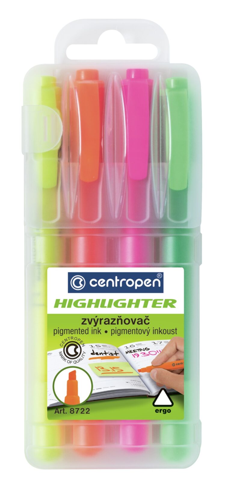 10/ celofluorescenční zvýrazňovač, ERGO držení, fluorescenční pigmentový inkoust, na všechny druhy papíru, klínový hrot, šířka stopy 1-4 mm, sada 4 barev